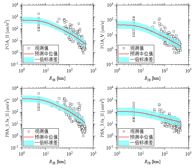 圖1 Mw7.8土耳其地震觀測記錄強(qiáng)度指標(biāo)隨距離衰減及其與預(yù)測中位值的對比