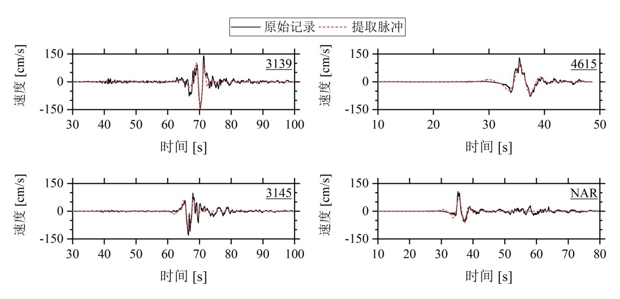 利用強(qiáng)震動觀測記錄識別了此次地震中近斷層地震動是否存在速度脈沖效應(yīng)。結(jié)果顯示,公開發(fā)布的18組強(qiáng)震動記錄是典型的脈沖型地震動(見表1),部分脈沖記錄及提取的速度脈沖見圖2。