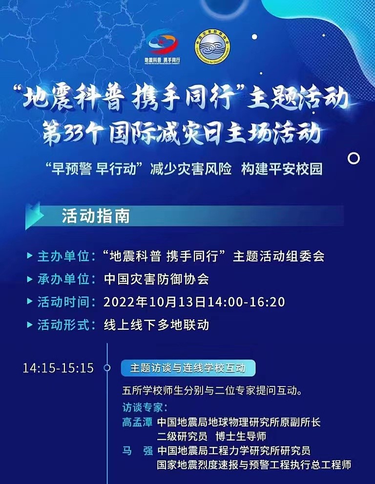 發(fā)布時(shí)間: 2022-10-14 點(diǎn)擊數(shù)量:6336今年10月13日是第33個(gè)國際減災(zāi)日,我所圍繞 “早預(yù)警、早行動(dòng)”活動(dòng)主題開展多類型、多渠道、多樣式防震減災(zāi)系列科普宣傳活動(dòng),宣傳效果顯著。