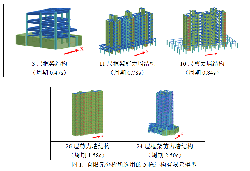 為評估結(jié)構(gòu)在此次地震動的破壞水平,選取了實際記錄到的儀器烈度對應的5組強震記錄,開展了針對當?shù)乜拐鹪O防烈度為8度0.2g的5棟典型鋼筋混凝土結(jié)構(gòu)房屋的非線性動力響應時程分析。5棟結(jié)構(gòu)包括1棟框架、2棟框剪及2棟剪力墻,結(jié)構(gòu)基本周期從小到大分別是0.47s,0.78s,0.84s,1.5s和2.5s。分析主要給出了對結(jié)構(gòu)安全和建筑內(nèi)人員體感影響明顯的層間相對位移和樓層加速度響應結(jié)果。表2為選取的地震動記錄相關(guān)信息。圖1為選取的5棟結(jié)構(gòu)的有限元模型示意圖,圖2至圖6為五棟結(jié)構(gòu)的初步分析結(jié)果。