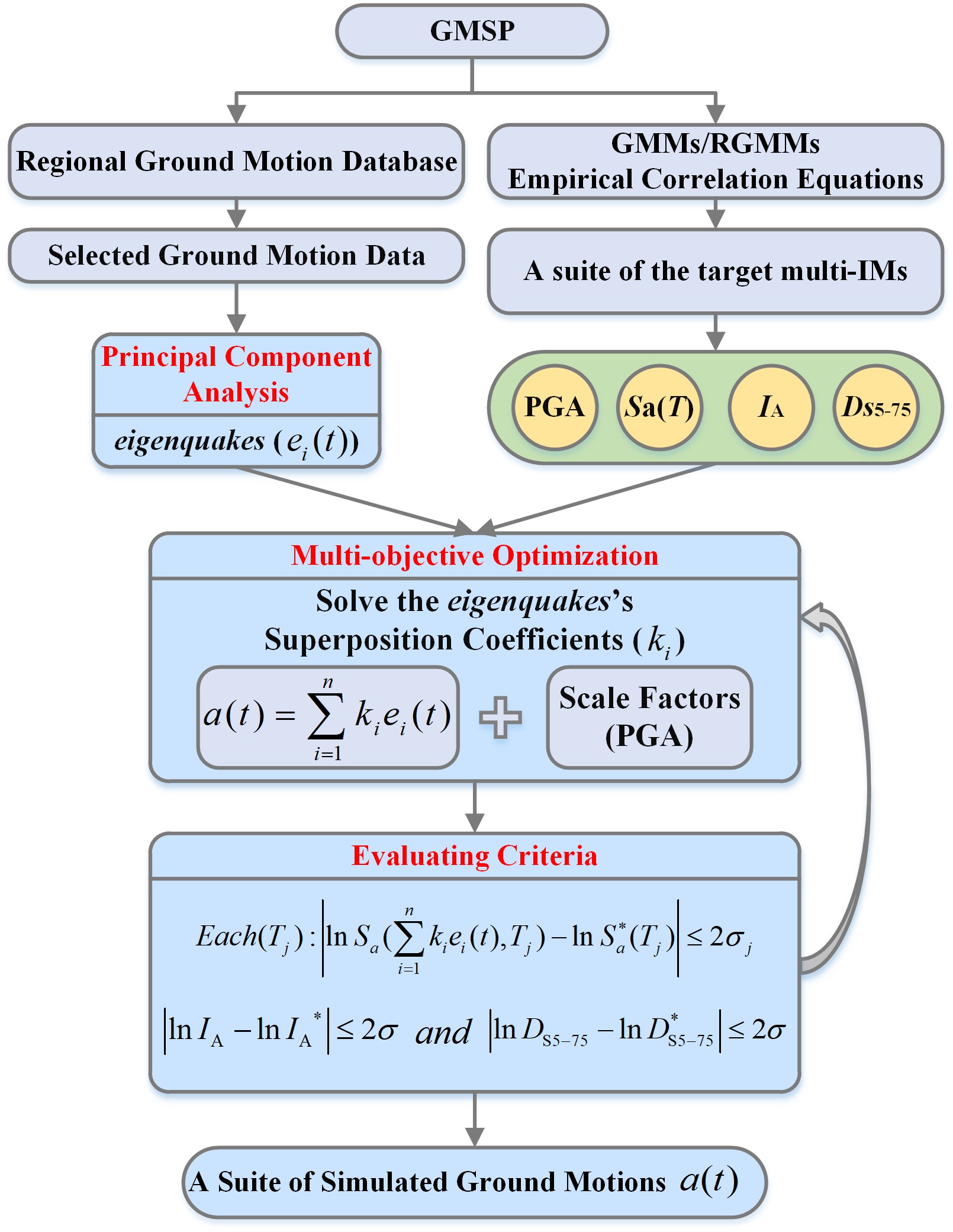 本研究構建了一套基于特征提取匹配多強度指標的地震動模擬程序(GMSP,見圖1)。該地震動模擬程序的目的是在設定地震情景下為單一場點生成一組充分考慮地震動幅值、頻譜、持時和累積能量的加速度時程。多個標量地震動強度指標被選取建立了目標矢量強度指標([IA, DS5-75, PGA, SA(T)]),該矢量強度指標被用于在模擬過程中控制擬合優(yōu)度。GMSP通過將一組實際地震動記錄經(jīng)主成分分析方法(PCA)特征提取后得到一組標準的正交基向量,即eigenquakes。采用多目標遺傳算法結合約束條件進行迭代尋優(yōu),求解每個eigenquake對應的線性疊加系數(shù)。最終,在時域上完成縮放疊加得到模擬地震動記錄。