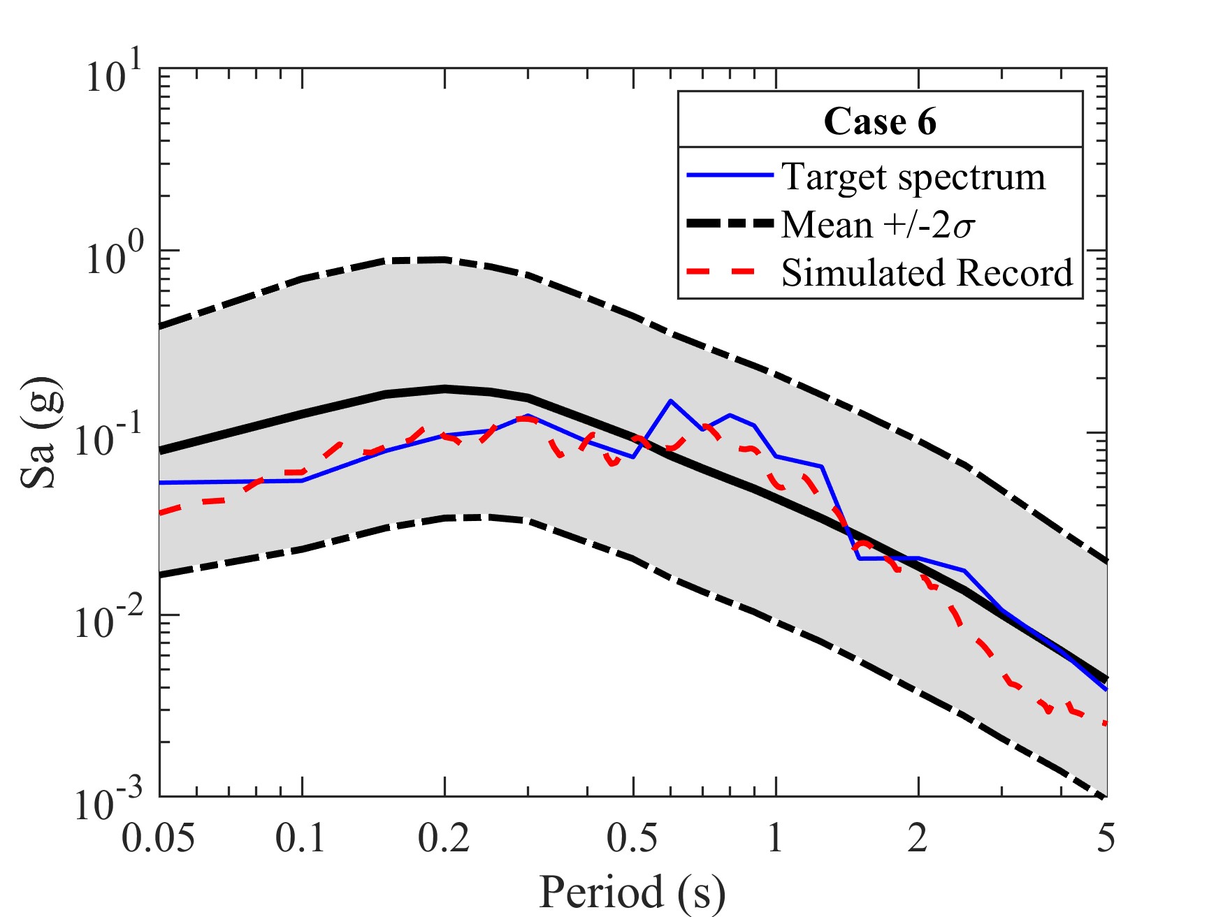 以日本關東為目標區(qū)域,具體應用了本文的地震動模擬程序?;谀繕耸噶繌姸戎笜说亩嘣龖B(tài)分布,由拉丁超立方抽樣(LHS)給出了目標多強度指標(見圖2)。由GMSP生成的11條模擬地震動記錄計算得到了多強度指標的模擬值(見圖3)。從圖中可以看出,模擬反應譜的譜值都分布在目標均值譜兩倍標準差范圍內,且非頻譜參數(shù)的模擬值與目標值分布也基本一致。圖4中給出了算例6中地震動記錄詳細的模擬結果。這些模擬結果表明:該地震動模擬程序能夠實現(xiàn)對于地震動幅值、頻譜、持時和累積能量的協(xié)調匹配,可以為結構動力分析提供合理的輸入。