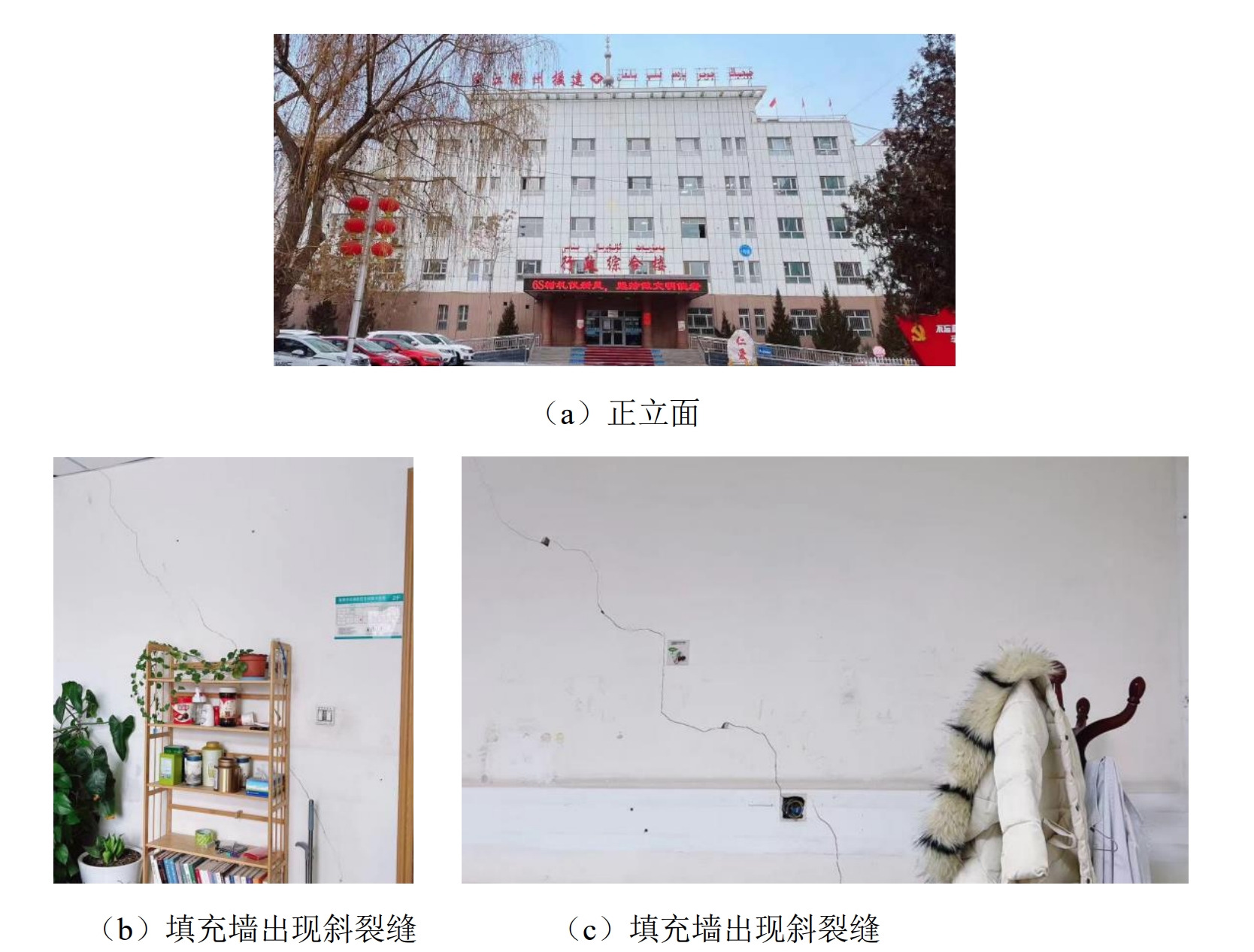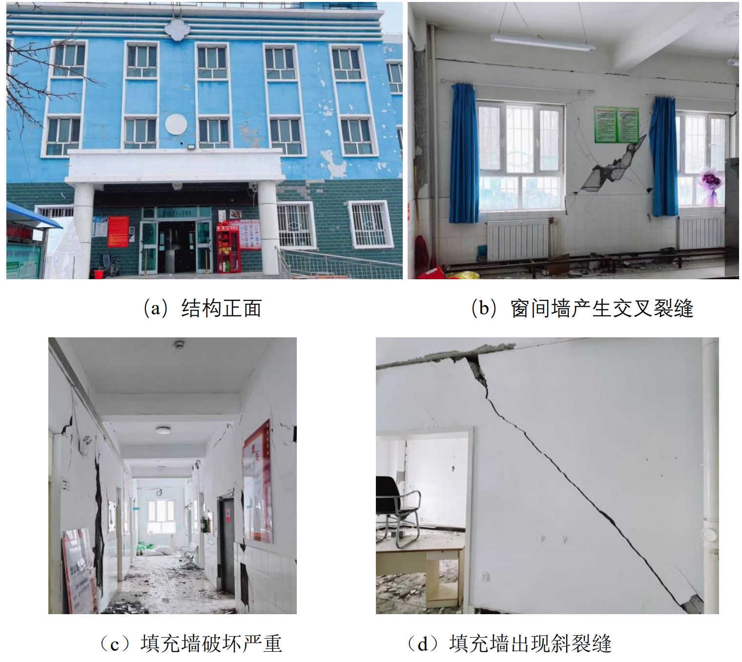 科考隊(duì)主要考察了Ⅶ度(7度)區(qū)內(nèi)具有抗震設(shè)防的醫(yī)院、衛(wèi)生院等建筑,主要包括框架結(jié)構(gòu)、框架-剪力墻結(jié)構(gòu)、消能減震結(jié)構(gòu)以及早年建造的砌體結(jié)構(gòu)。通過(guò)調(diào)查發(fā)現(xiàn),框架結(jié)構(gòu)的梁柱構(gòu)件基本完好,部分填充墻與框架梁之間因變形不協(xié)調(diào)出現(xiàn)輕微裂縫,少數(shù)填充墻出現(xiàn)交叉斜裂縫;消能減震結(jié)構(gòu)基本完好,阻尼器上、下剪力墻錯(cuò)動(dòng)導(dǎo)致剪力墻兩側(cè)填充墻抹灰層開裂。