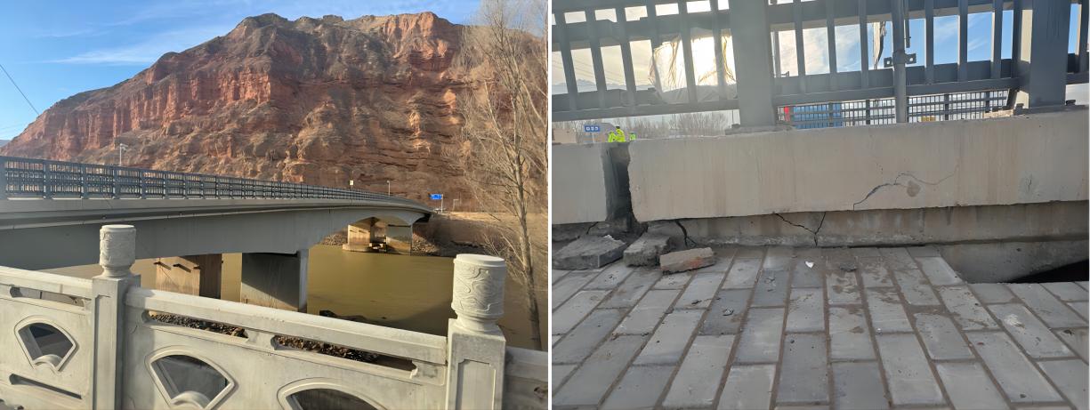 調(diào)查簡(jiǎn)述:大河家黃河大橋舊橋?yàn)殇摌?gòu)橋,橋梁主體橋墩、梁未發(fā)現(xiàn)明顯裂縫,在兩端橋臺(tái)發(fā)生嚴(yán)重破壞,梁端擋快由于碰撞發(fā)生沿?fù)蹩斓男绷芽p;橋面局部護(hù)欄發(fā)生較大尺寸外閃;大河家黃河大橋新橋?yàn)檫B續(xù)梁橋,橋梁主體橋墩未發(fā)現(xiàn)明顯裂縫,梁體在甘肅側(cè)橋臺(tái)處發(fā)生碰撞,局部梁體產(chǎn)生可見裂縫,伸縮縫處縫隙加大,且向青海側(cè)滑移3cm左右;橋梁青海一側(cè)橋臺(tái)發(fā)生嚴(yán)重裂縫,裂縫寬度5cm左右。梁體有逆時(shí)針轉(zhuǎn)動(dòng)傾向。在大河家黃河大橋旁邊的廣場(chǎng)有一個(gè)簡(jiǎn)支梁公路橋,該橋主體完好,在橋臺(tái)處欄桿有外閃,以及橋面與路面的撞擊裂縫。