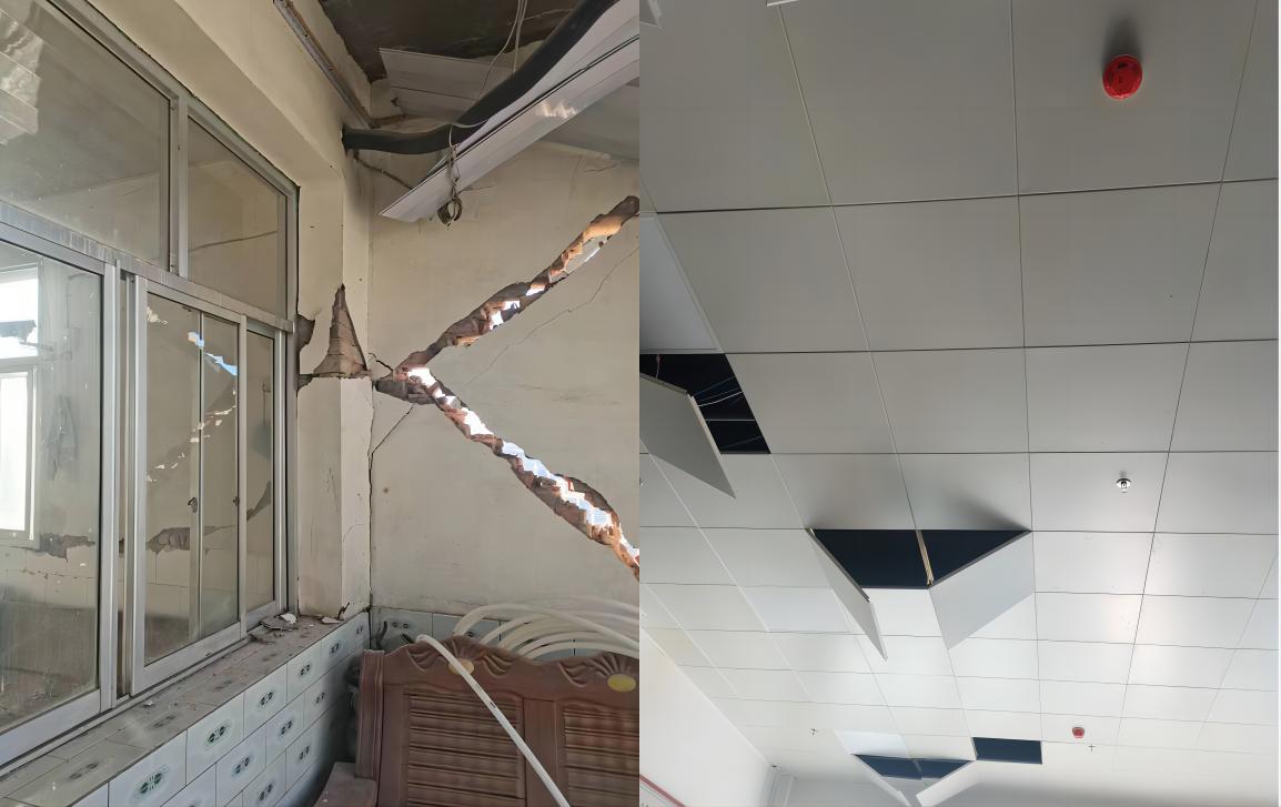 1.調(diào)查大河家中學(xué)教學(xué)樓、實(shí)驗(yàn)樓、食堂和學(xué)生宿舍的震害情況。其中,4個(gè)結(jié)構(gòu)的結(jié)構(gòu)構(gòu)件均無明顯破壞,非結(jié)構(gòu)構(gòu)件砌體填充墻、吊頂破壞嚴(yán)重。雖無倒塌風(fēng)險(xiǎn),但使建筑的使用功能中斷。
