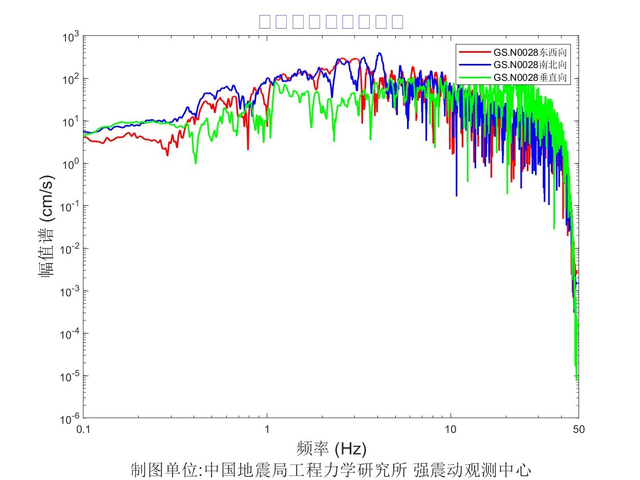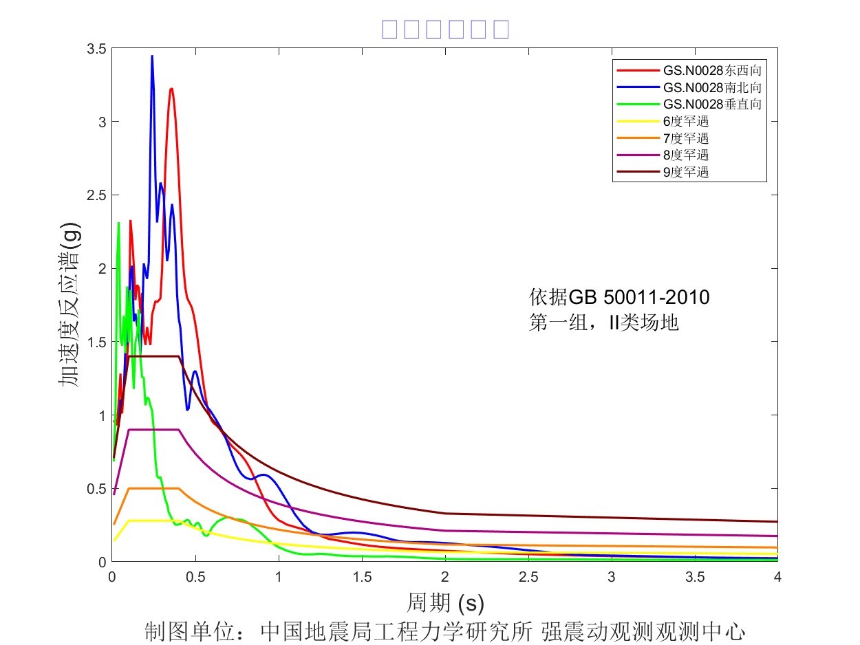 地震后工力所強(qiáng)震動(dòng)觀測(cè)中心共收取距震中100公里范圍內(nèi)實(shí)時(shí)強(qiáng)震儀記錄57組、烈度儀記錄182組。中心立即組織人員進(jìn)行處理。獲取記錄臺(tái)站加速度記錄分析結(jié)果見(jiàn)表1,其中GS.N0028 臺(tái)烈度最大,其震中距為13.6km,東西、 南北、 垂直向加速度峰值分別為 905.8cm/s2、778.5cm/ s2、-702.4cm/ s2,東西、南北、垂直向速度峰值分別為57.3cm/s、-52.1cm/s、-16.3 cm/s,計(jì)算儀器地震烈度9.5度。GS.N002B 臺(tái)峰值加速度最大,其震中距為12.3km,東西、 南北、 垂直向加速度峰值分別為 1071.4cm/s2、856.8cm/ s2、796.1cm/ s2,東西、南北、垂直向速度峰值分別為-30.7cm/s、-21.5cm/s、-10.1 cm/s,計(jì)算儀器地震烈度9.2度。GS.N0027臺(tái)震中距最小,其震中距為5.8km,東西、南北、垂直向加速度峰值分別為823.9cm/s2、-533.3cm/ s2、 692.7cm/ s2,東西、南北、垂直向速度峰值分別為-39.8cm/s、-28.9cm/s、-11.3 cm/s,計(jì)算儀器地震烈度8.8度。儀器地震烈度分布圖見(jiàn)圖1,地震峰值加速度分布圖見(jiàn)圖2,地震峰值速度分布圖見(jiàn)圖3,地震加速度反應(yīng)譜(T=0.3s、T=1.0s、T=3.0s)分布圖見(jiàn)圖4、圖5、圖6,GS.N0028 臺(tái)強(qiáng)震動(dòng)記錄見(jiàn)圖7,GS.N0028臺(tái)加速度反應(yīng)譜見(jiàn)圖8,GS.N0028臺(tái)傅里葉幅值譜見(jiàn)圖9,GS.N002B臺(tái)強(qiáng)震動(dòng)記錄見(jiàn)圖10,GS.N002B臺(tái)加速度反應(yīng)譜見(jiàn)圖11,GS.N002B臺(tái)傅里葉幅值譜見(jiàn)圖12,GS.N0027臺(tái)強(qiáng)震動(dòng)記錄見(jiàn)圖13,GS.N0027臺(tái)加速度反應(yīng)譜見(jiàn)圖14,GS.N0027臺(tái)傅里葉幅值譜見(jiàn)圖15。