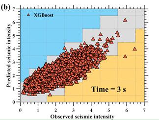 圖1 3秒時間窗下的預測值和觀測到的地震烈度的比較,時間表示時間窗的大小?;疑珔^(qū)域是正確的預測值,藍色區(qū)域是高估的預測值,黃色區(qū)域是低估的預測值。綠點表示(a)Pd模型,紅三角表示(b)xgBoost模型。