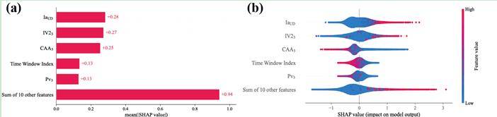 圖3 (a)基于SHAP值的參數(shù)的全局重要性排名。(b) 不同參數(shù)的SHAP匯總圖,數(shù)據(jù)點的顏色從藍色(低)到紅色(高)過渡代表參數(shù)的低值到高值。