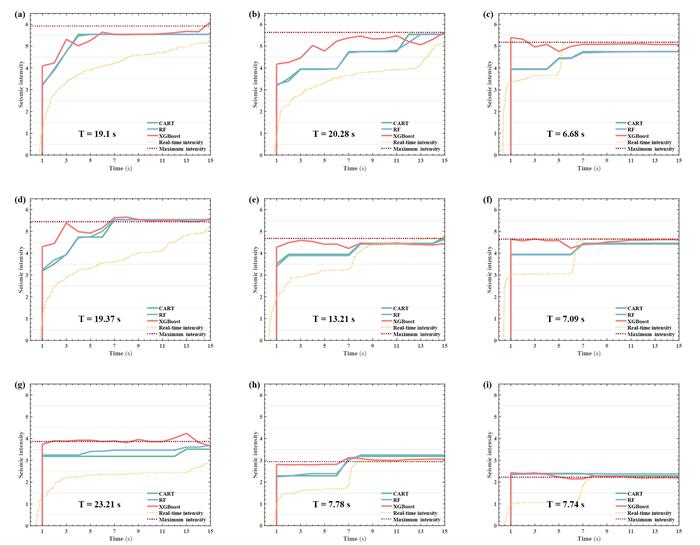 圖4 每個模型對不同烈度范圍的實時預測性能。綠色的藍線和紅線表示CART RF和xgBoost模型的實時預測,黃色的虛線表示觀察到的實時烈度,水平紅線表示觀察到的最大烈度。時間T表示實時烈度達到最大值的時刻。