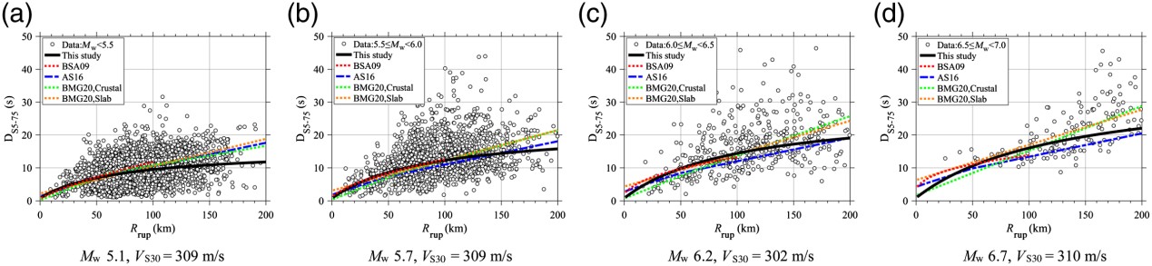 發(fā)布時間: 2023-04-11 點(diǎn)擊數(shù)量:112093)當(dāng)斷層距大于100 km時,持時的SVR-GMMs預(yù)測結(jié)果小于BMG20(圖4)。當(dāng)M<5.5時,顯著持時隨距離衰減存在明顯的遠(yuǎn)場飽和現(xiàn)象,顯著持時的飽和距離為100 km。本文開發(fā)的SVR-GMMs有效地捕捉到了顯著持時存在的這一區(qū)域衰減特征。