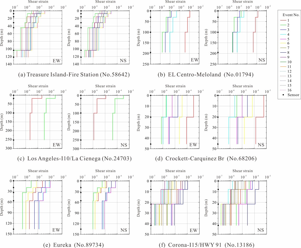 圖1. 本研究建立的6個(gè)巖土臺陣分別在EW和NS的剪切應(yīng)變剖面。