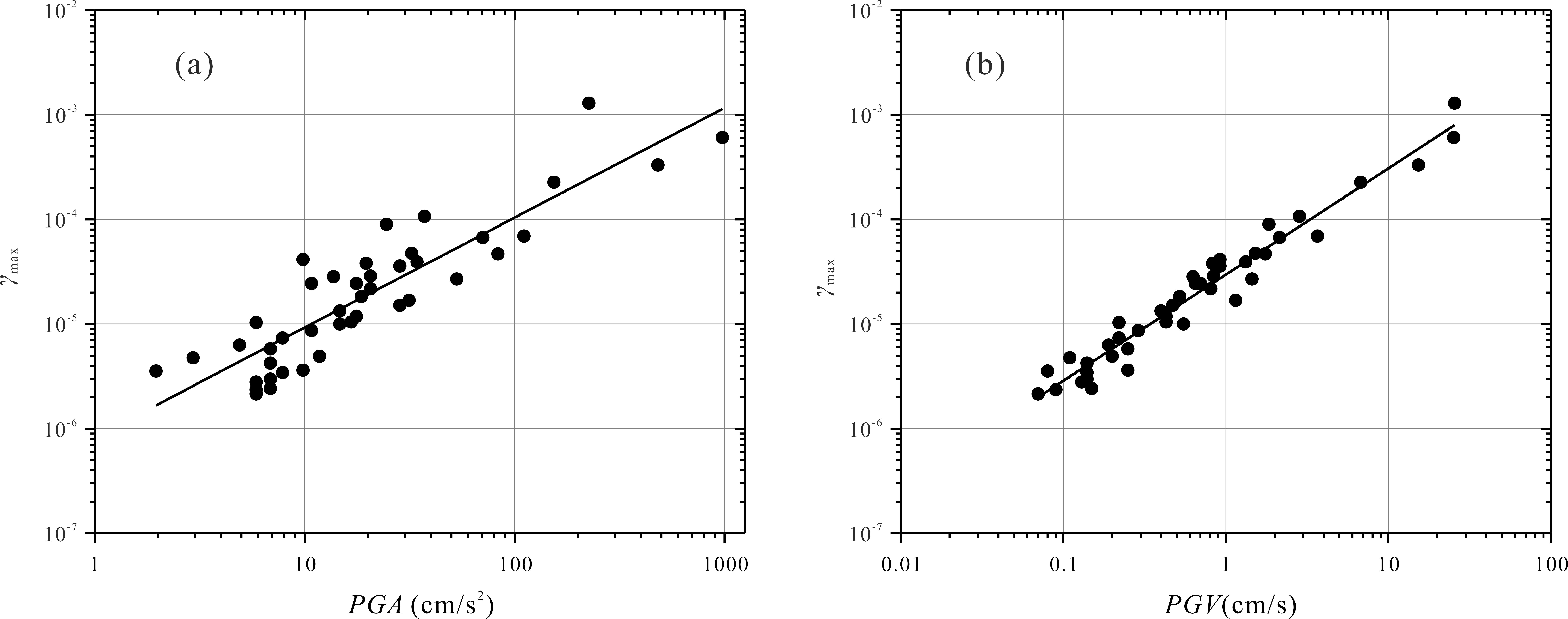圖2. 近地表上部土體的最大原位剪切應(yīng)變(γmax)分別與PGA、PGV的關(guān)系。(a)γmax與PGA的關(guān)系;(b)γmax與PGV的關(guān)系。