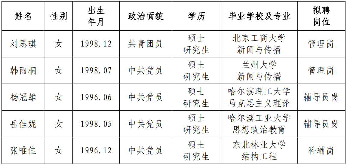 發(fā)布時(shí)間: 2022-03-28 點(diǎn)擊數(shù)量:15444根據(jù)中國地震局《關(guān)于貫徹執(zhí)行<事業(yè)單位公開招聘人員暫行規(guī)定>的通知》文件精神和我所用人計(jì)劃,經(jīng)公開發(fā)布招聘信息、資格審查、面試等程序確定擬錄人員?,F(xiàn)將擬錄人員相關(guān)情況公示如下,公示期7天,期間如有異議請與中國地震局工程力學(xué)研究所人才資源部或紀(jì)檢室聯(lián)系,以個(gè)人名義反映情況的須署真實(shí)姓名,以單位名義反映情況的須加蓋公章。