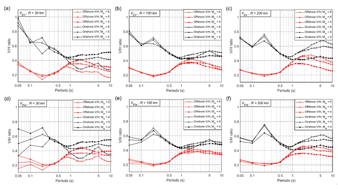 2)為了深入分析海/陸地震動輸入能量在水平與豎向的差異,分析了海底V/H輸入能量譜比,并與陸地地震動比較。結(jié)果表明,海底V/H輸入能量譜比與陸域譜比在震級、距離和周期等方面都存在較大差異,海底地震動的V/H輸入能量譜比在短周期均明顯小于陸地地震動,同時海底臺站間的V/H輸入能量譜比也存在較大的差異(見圖3)。